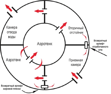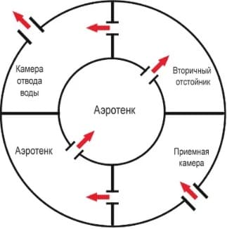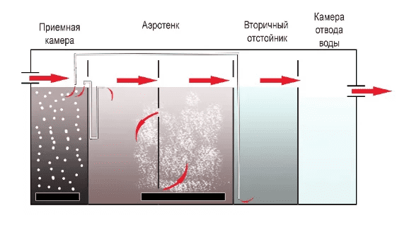 Дальше стоки самотеком поступают в аэротенк, где происходит насыщение кислородом. В таких условиях органические отходы окисляются полностью, а азотистые соединения проходят процесс нитрификации. В аэротенке живет основная масса активного ила. Аэротенк имеет 2 камеры, и стоки, циркулируя между этими камерами, многократно проходят процессы очистки с кислородом и без него, т.е. аэробные и анаэробные. В первой камере аэротенка на поверхности скапливается жировая пленка, которая собирается эрлифтом и отправляется обратно в приемную камеру для переработки.